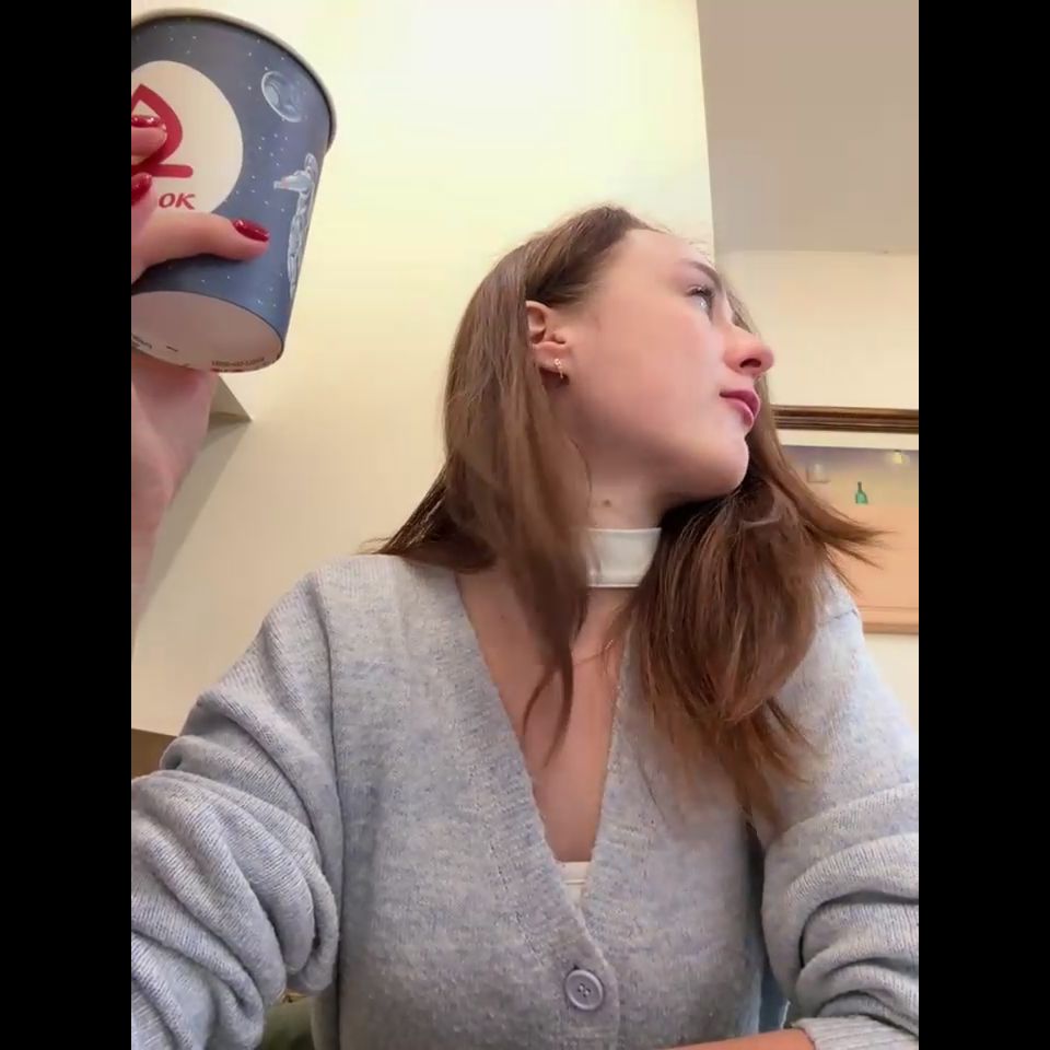 Squeeze nipplesnext to waiter in cafе